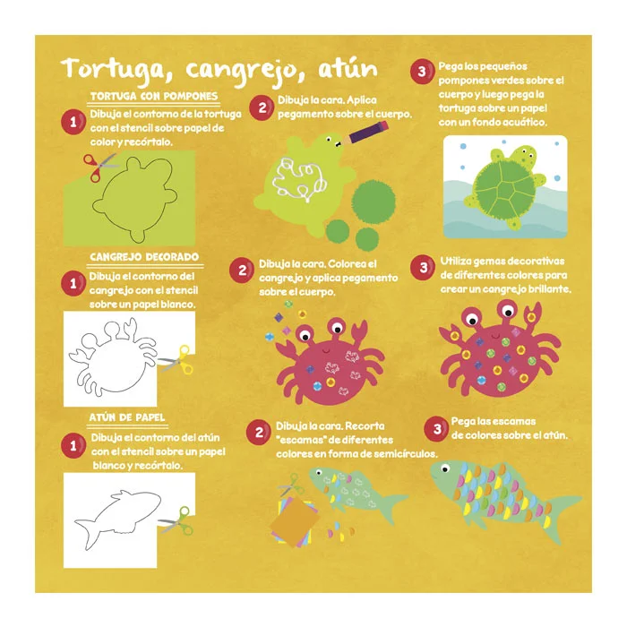 ¡Disfruta de hora de diversión creativa con los stencils de los animales marinos! Usa una y otra vez las formas extraíbles para coloridas actividades. Cuatro páginas con tres divertidos y creativos proyectos paso a paso.