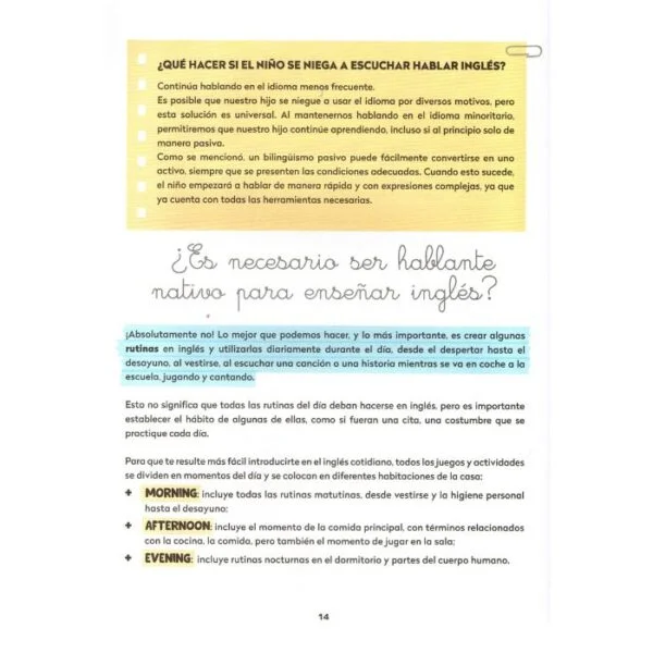 La mejor manera de aprender un idioma es utilizarlo en la VIDA DIARIA: los juegos propuestos en este libro de actividades están diseñados para adaptarse lo mejor posible a la RUTINA DIARIA, proporcionando ideas no solo para ampliar el vocabulario, sino también para usar frases simples en cualquier momento del día.